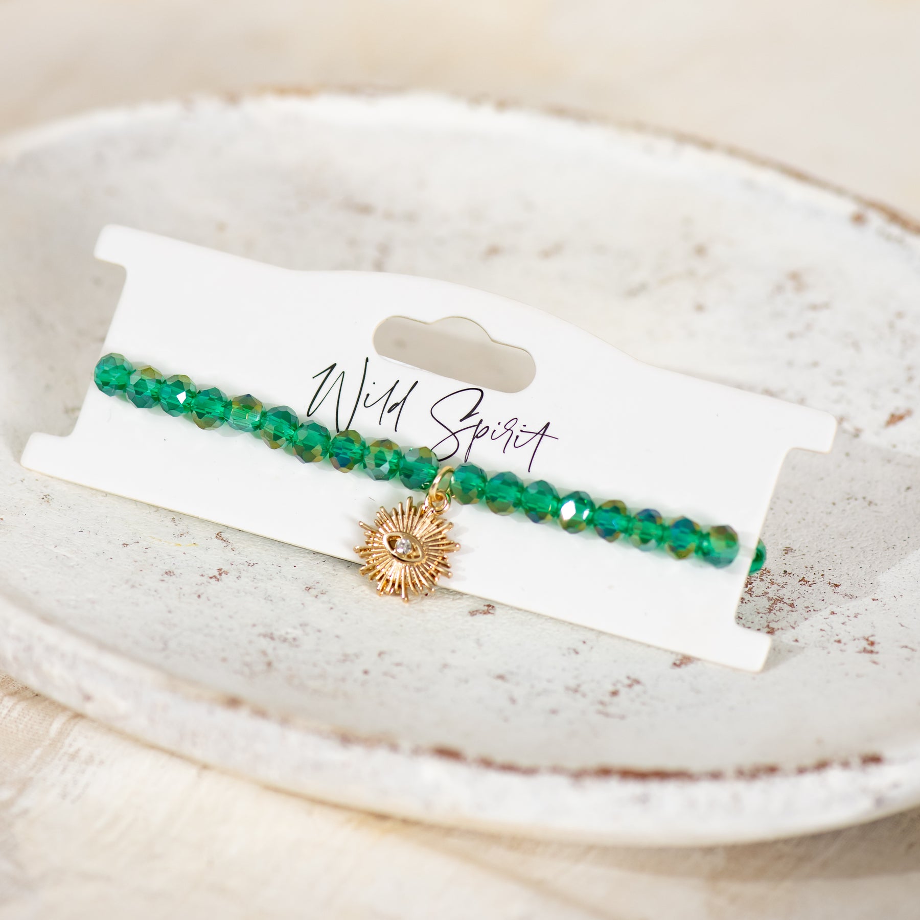 This bracelet features soothing green crystal beads and a delicate evil eye charm - a symbol of protection and positivity.