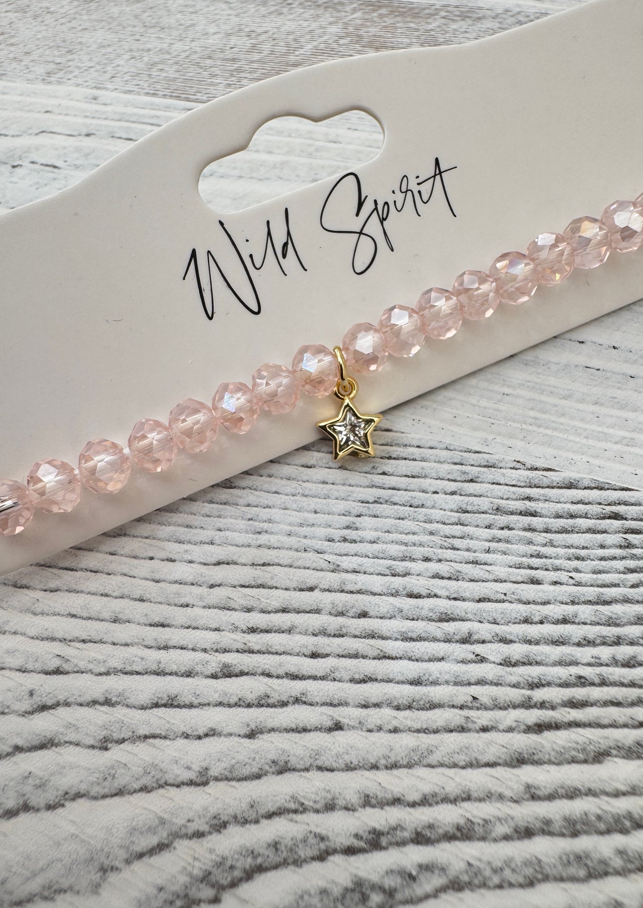 This bracelet features pink crystal beads and a delicate star charm - symbolising hope, guidance, and inner strength.