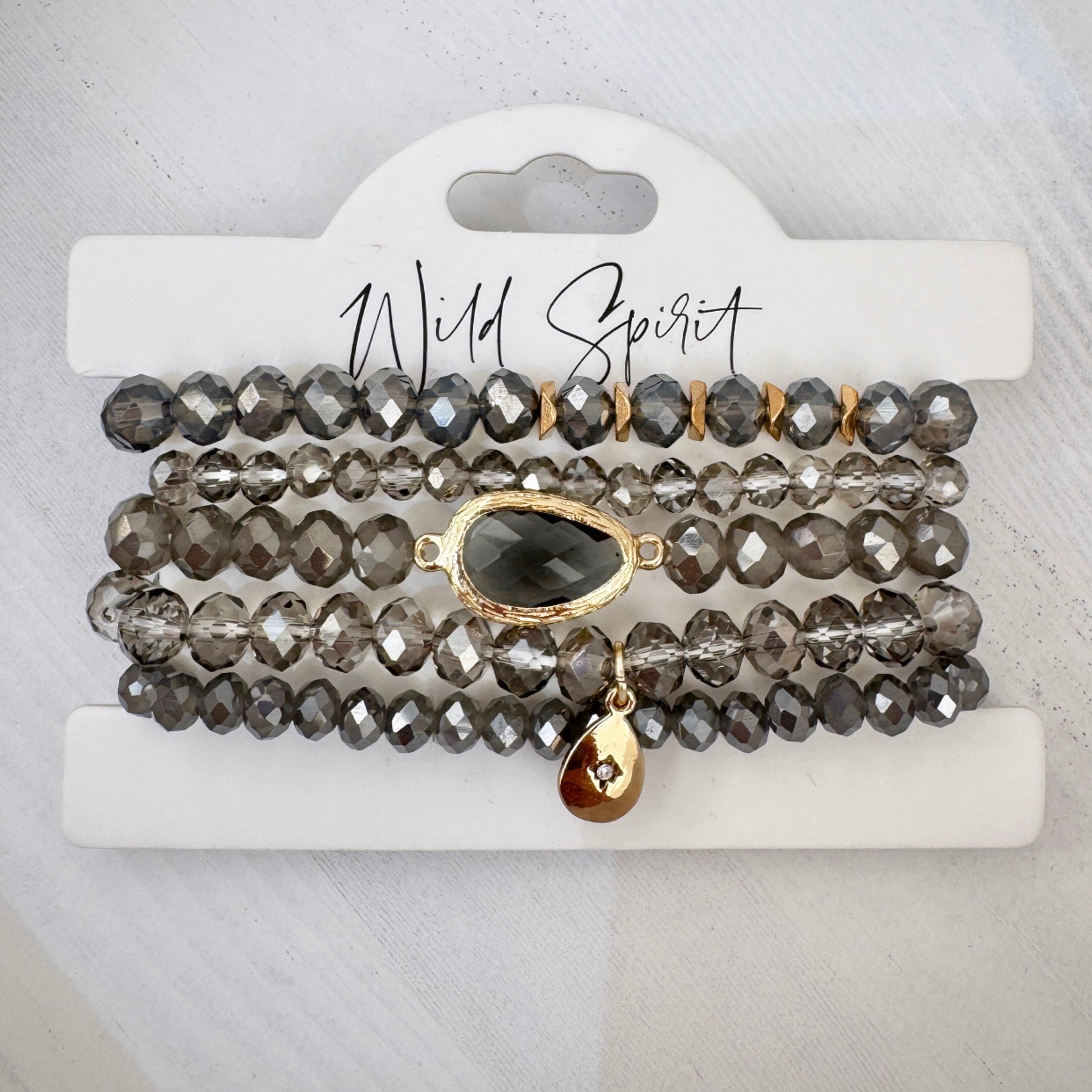 The Urban Twilight Stack is a five-piece set of faceted grey crystal bracelets designed for understated drama and effortless style.