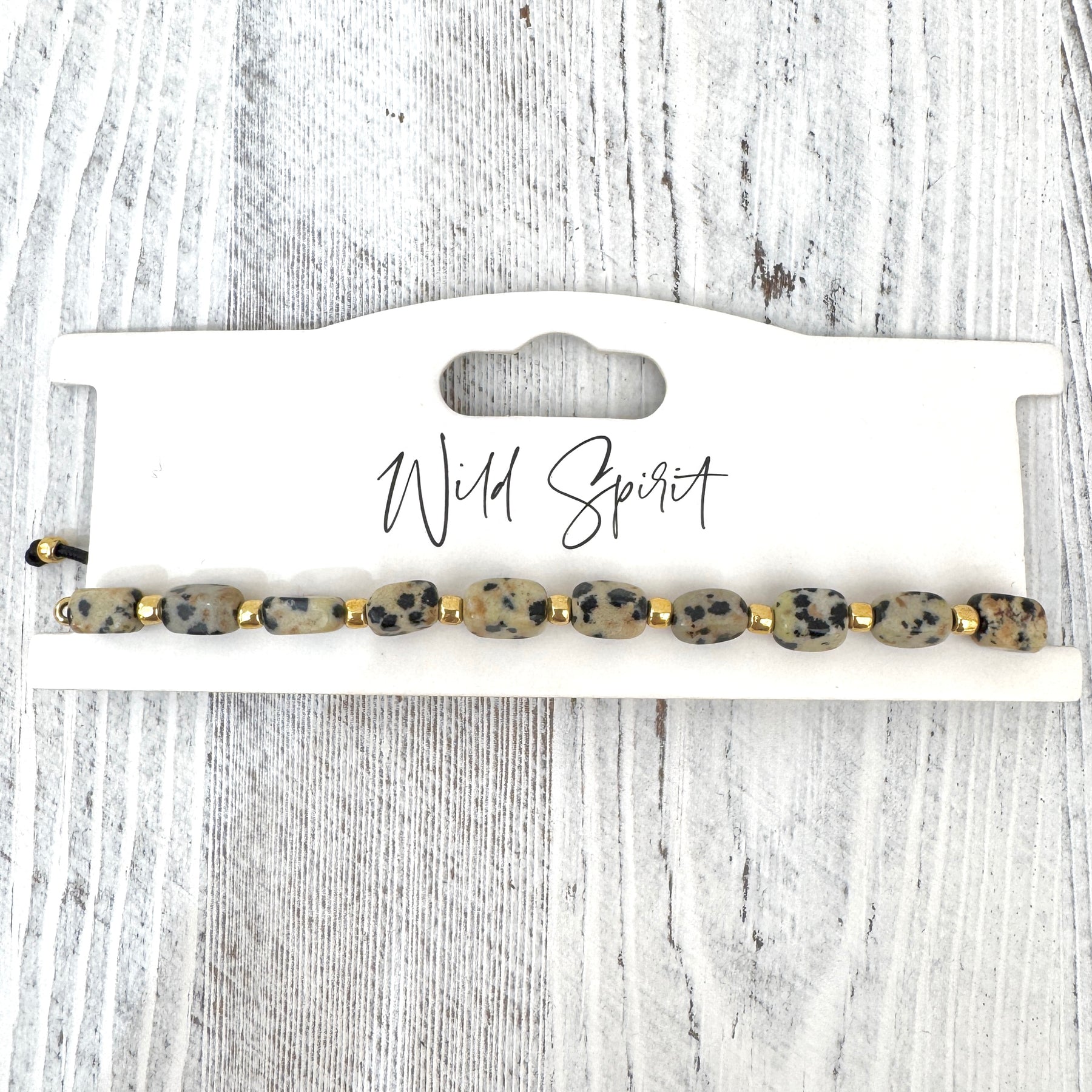 The Nomad Bracelet is a laid-back luxe essential – featuring smooth, oval-shaped natural stone nuggets of dalmatian jasper accented with gold spacer beads for a touch of understated glam.