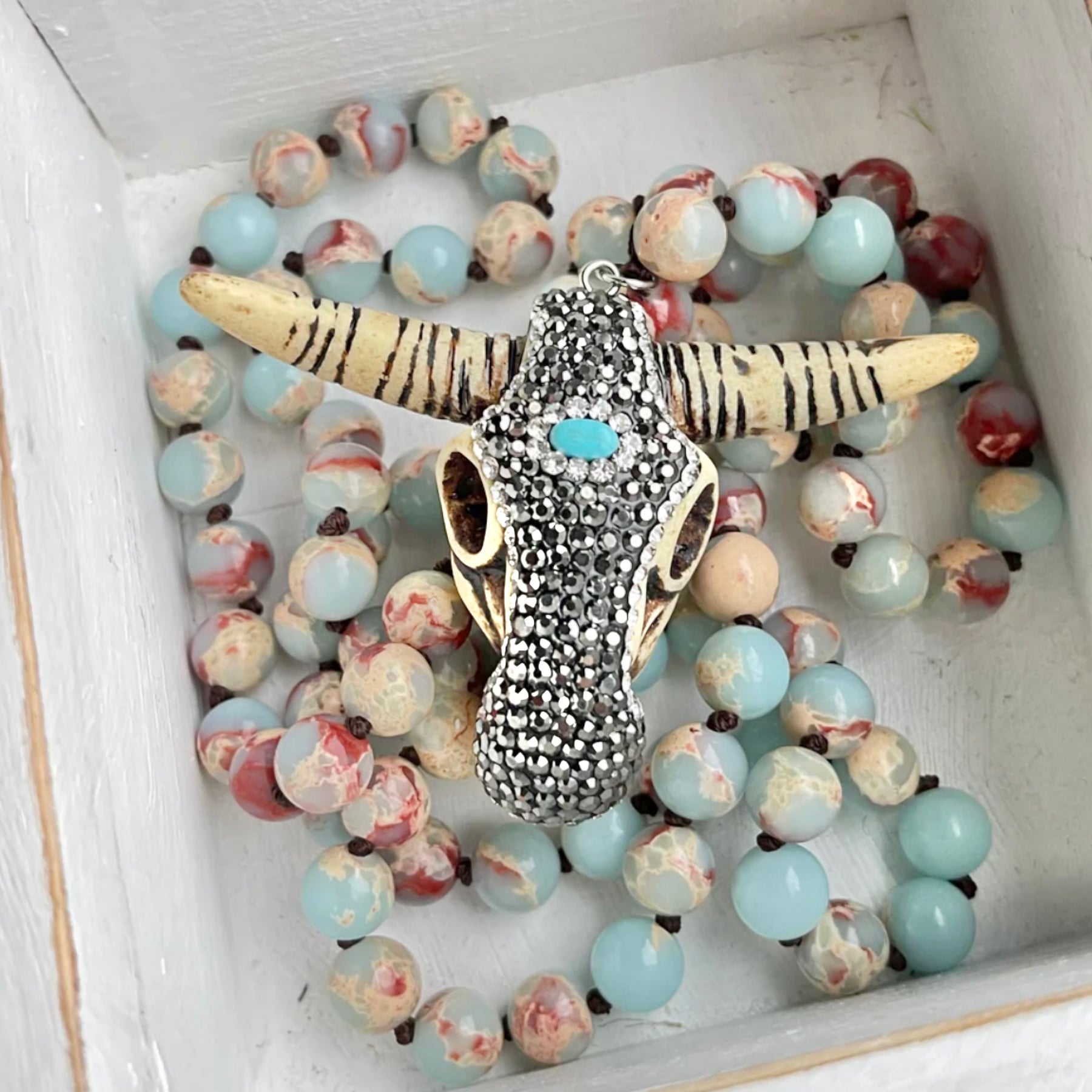 This long beaded chain necklace is made from blue jasper marbled stones. A beautiful crystal buffalo head pendant with blue third eye highlights the spiritual qualities of this animal.