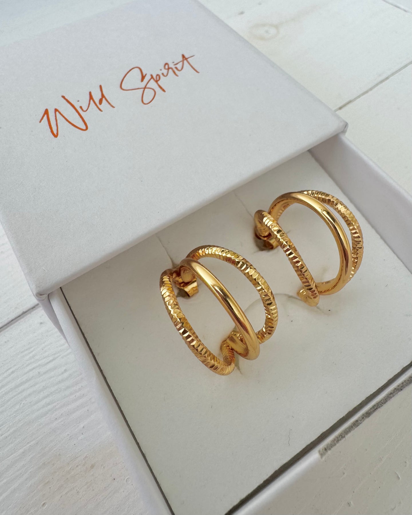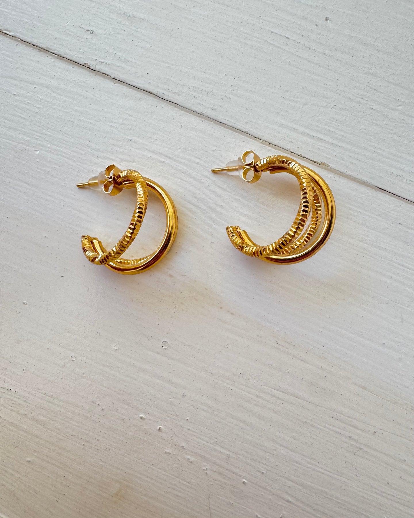 Designed in a sleek triple-hoop silhouette, these stunning earrings are crafted from hypoallergenic stainless steel and finished in a luxe 18k gold plating for long-lasting shine.