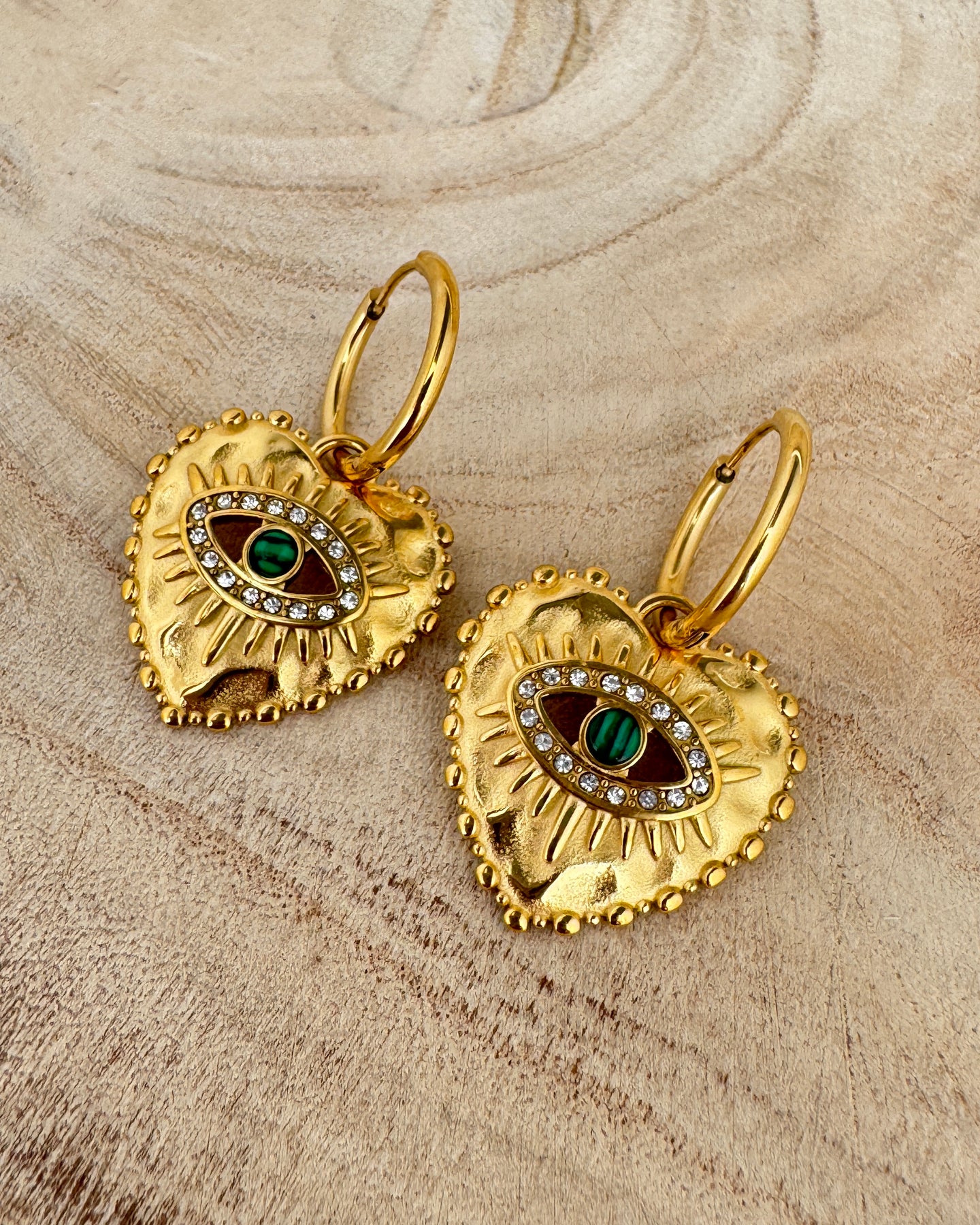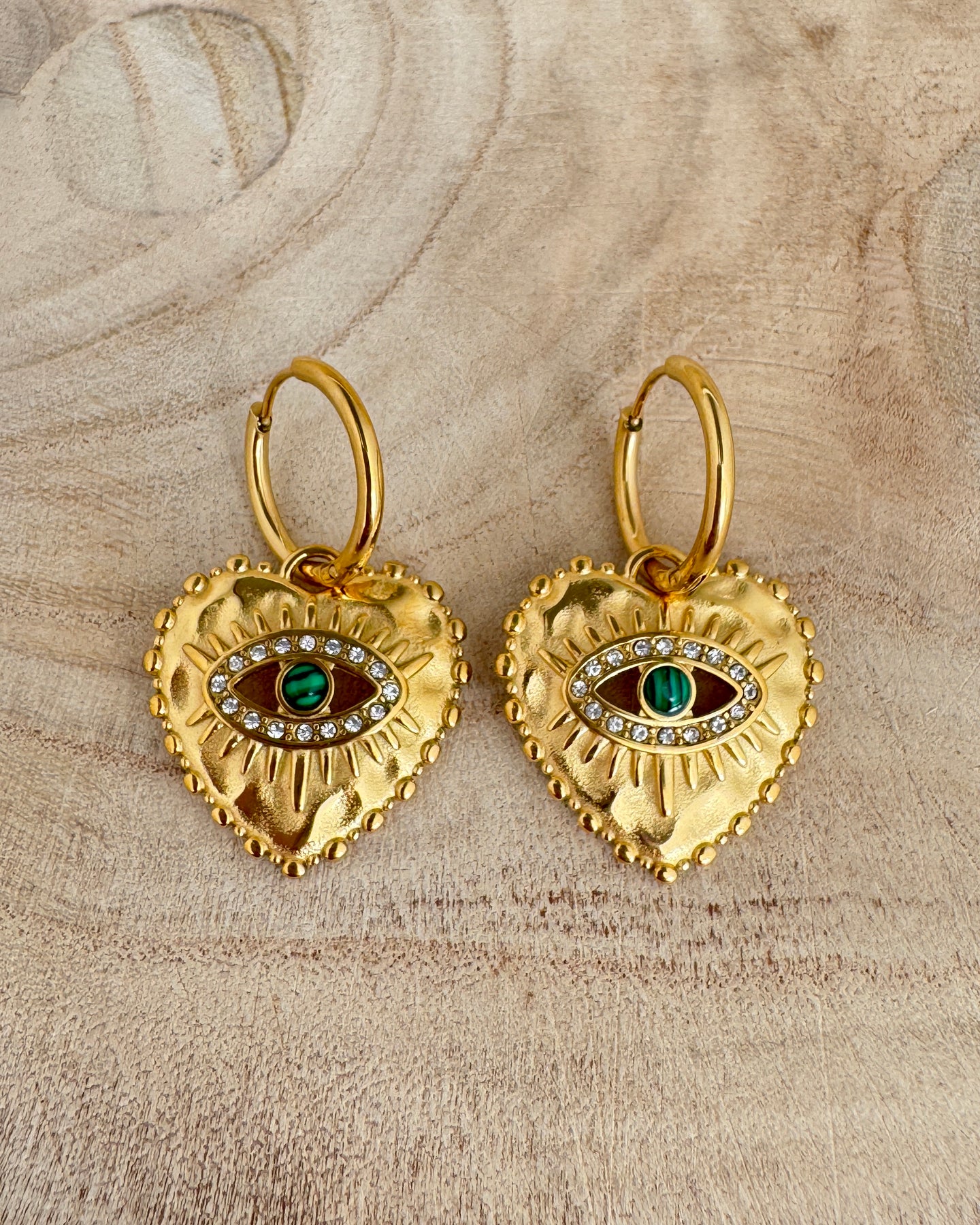 💫 Enchantment Earrings – gold-plated hoop earrings with malachite-style hearts and evil eye sparkle for protection & charm