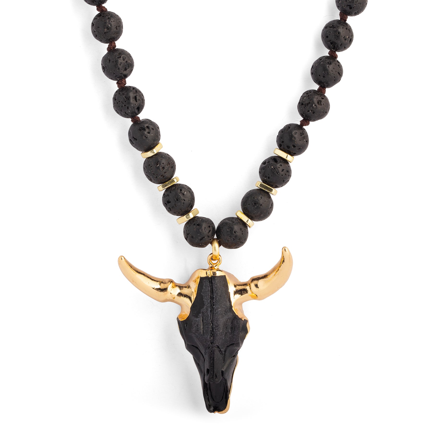 The Wildhorn Necklace reimagines our original Buffy favourite with a sleeker, more refined finish. This striking statement piece features a hand-beaded lava bead chain accented with gold-plated spacer beads, finished with a bold gold longhorn resin skull pendant at its centre.
