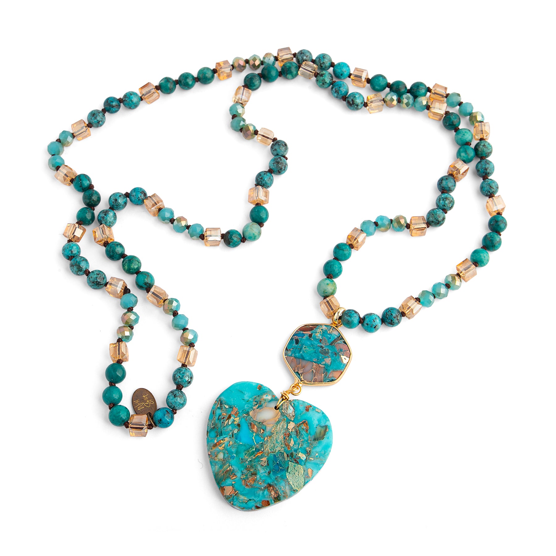 Finished with a beautiful double drop pendant, featuring a small hexagon leading to a striking heart-shaped pendant, this long necklace brings movement, colour, and personality to any look.