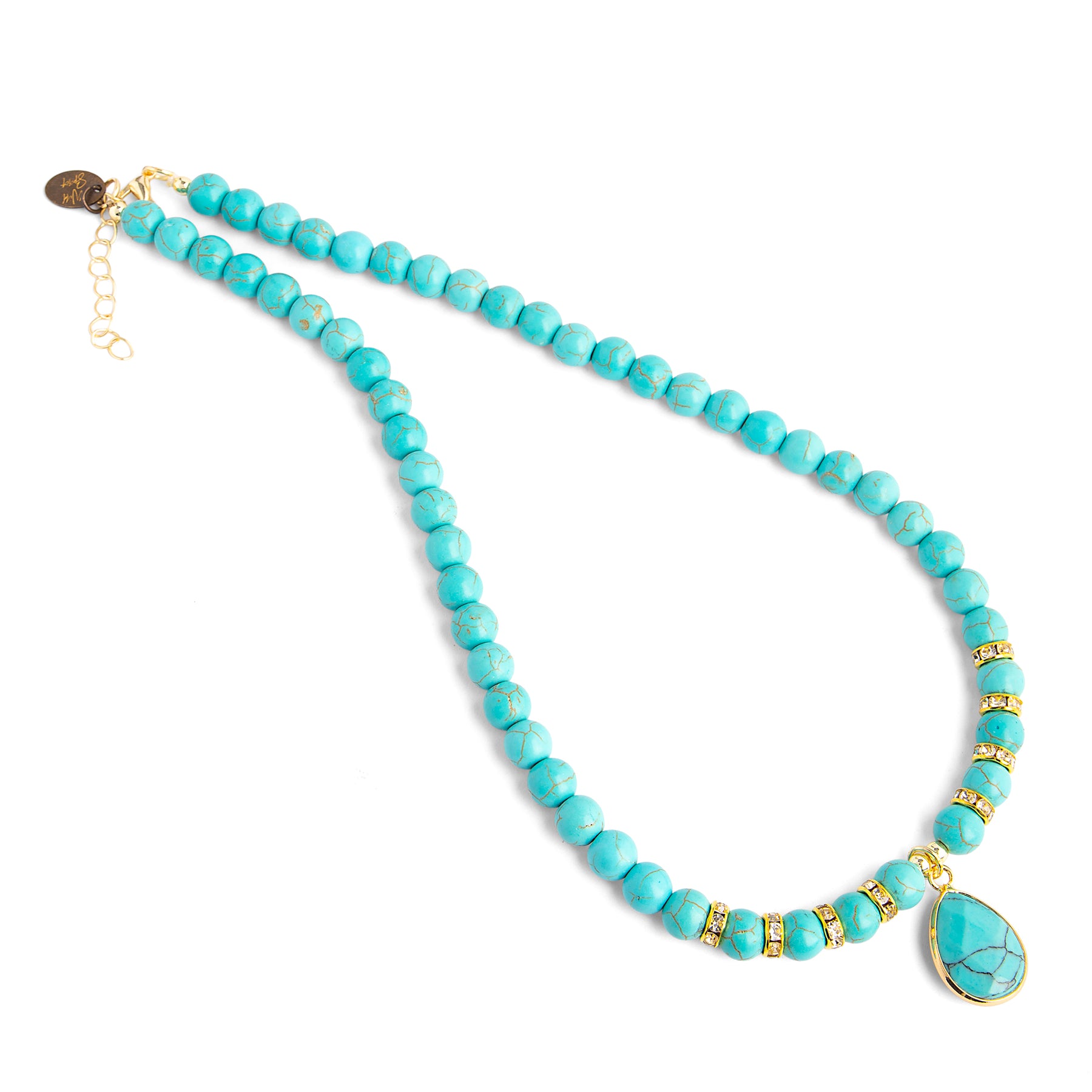 This exquisite short necklace features turquoise howlite beads, each uniquely dyed to showcase lively shades reminiscent of sunny skies and warm desert landscapes.