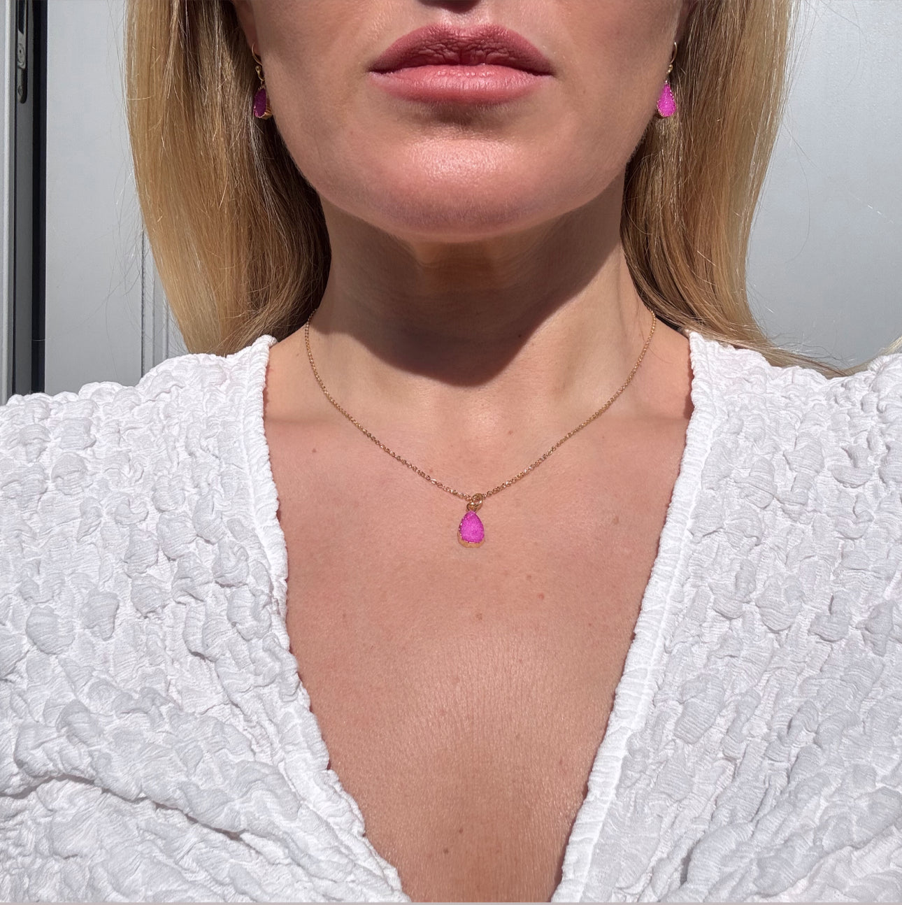 Lightweight, versatile, and effortlessly chic, this pink druzy necklace is your go-to accessory for everything from brunch dates to evenings out.