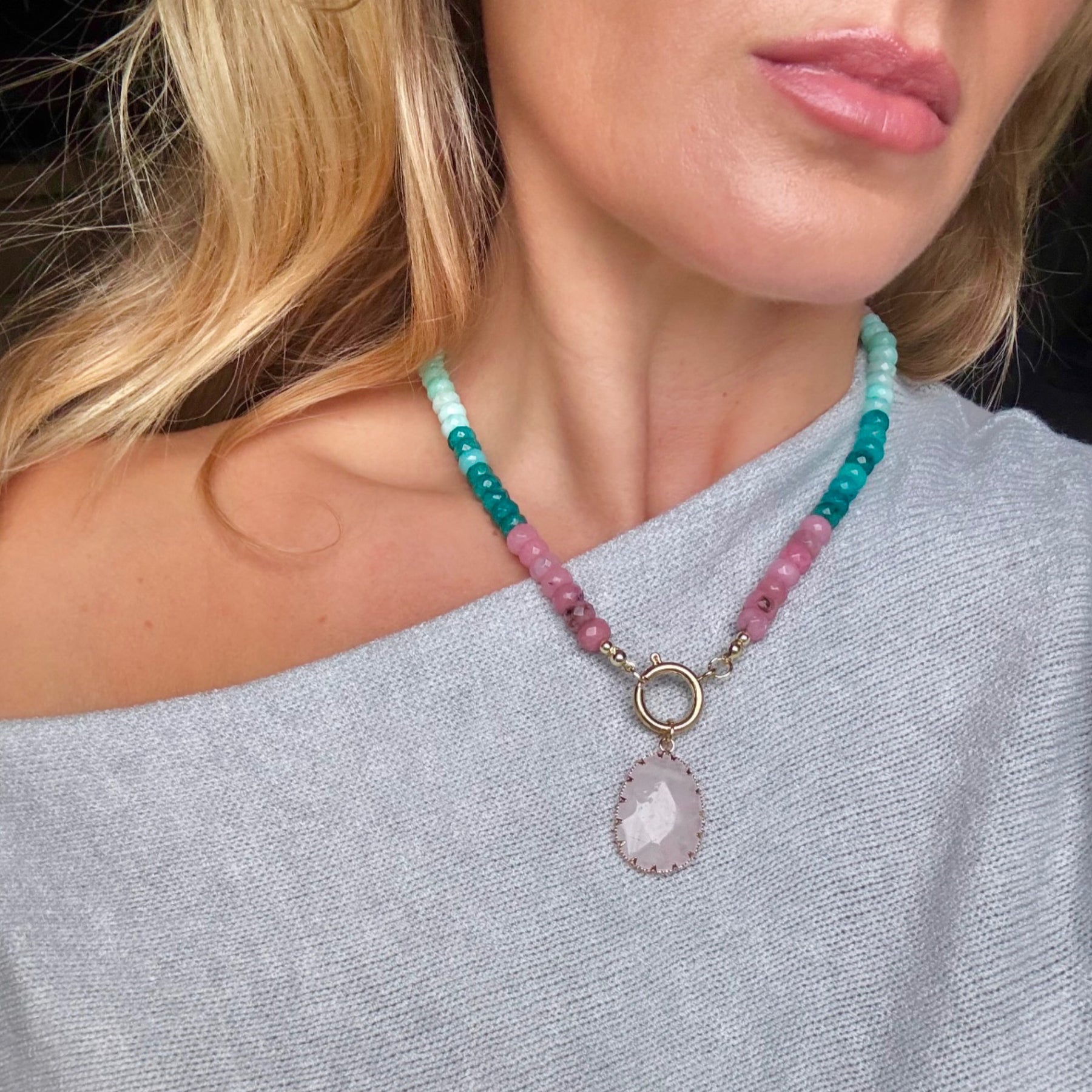 The real magic? The detachable rose quartz pendant. Wear it for a bold, eye-catching look, or remove it for a minimalist vibe that lets the pastel beads shine on their own. Perfect for day-to-night transitions, this piece is as adaptable as it is gorgeous.
