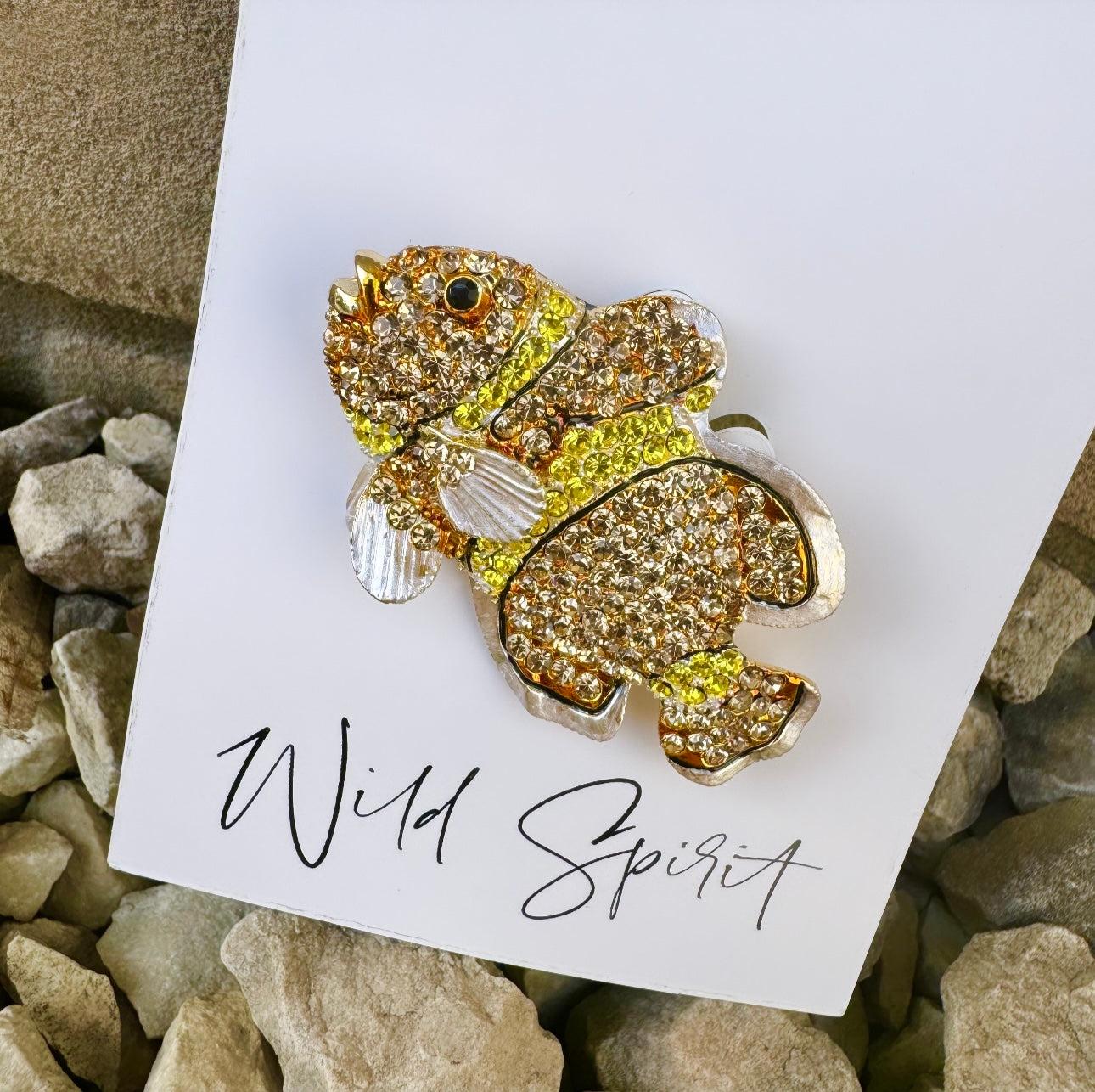 Dive into a world of colour and charm with our Vibrant Clownfish Brooch embellished with gold and yellow toned crystals.