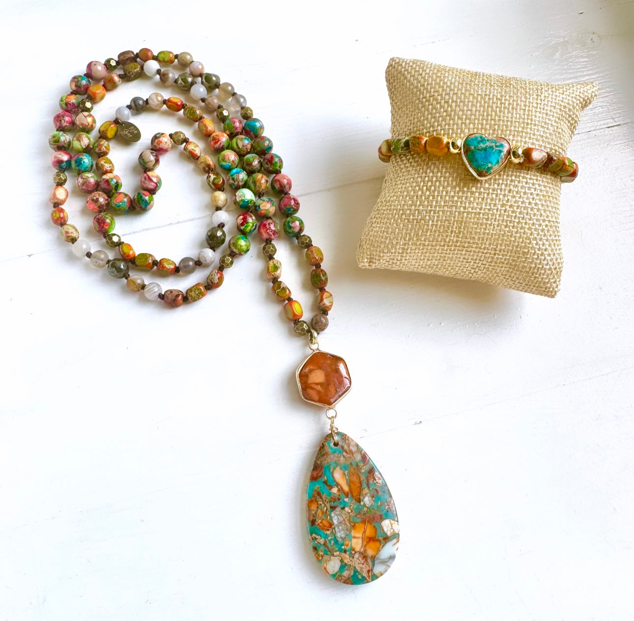 Handcrafted from emperor stones, this stunning bracelet features a vibrant mix of orange, blue, and yellow hues, centred with a polished heart-shaped stone.