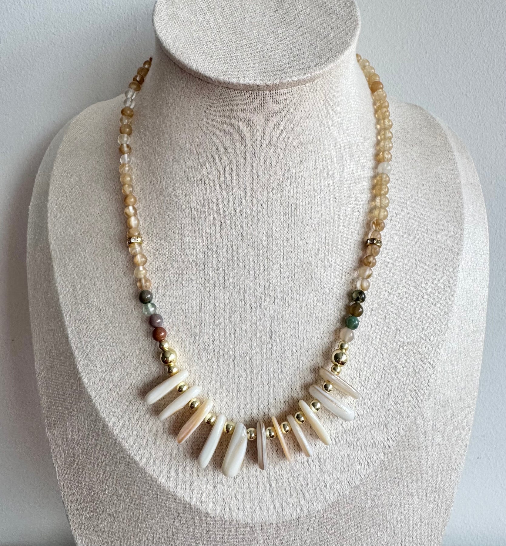 The Mika Necklace is a stunning piece handcrafted with a mix of dainty and tribal-style beads, creating the perfect blend of modern charm and boho energy. Its shorter length sits beautifully along the collarbone, adding a subtle yet striking statement to any neckline.
