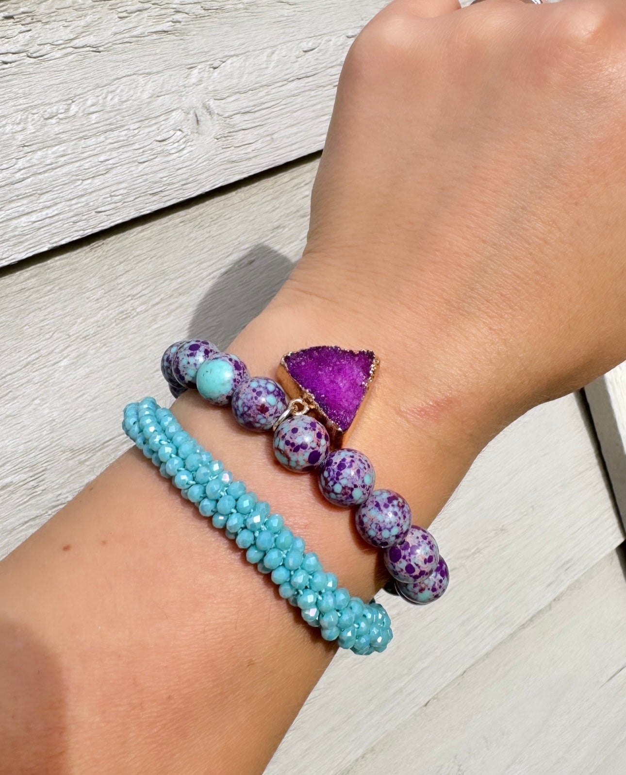 Add a burst of colour and energy to your wrist with this stunning set of purple and blue jasper stone bracelets!